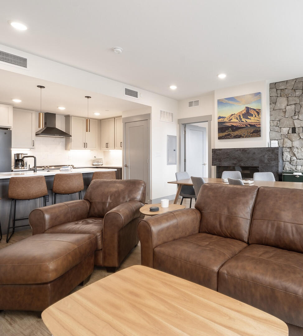 Unwind with plush leather seating, two large TVs, a six-person dining table, and a warm electric fireplace. The kitchen features counter seating for four and is fully stocked with everything you need for a home-cooked meal.